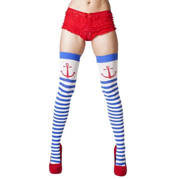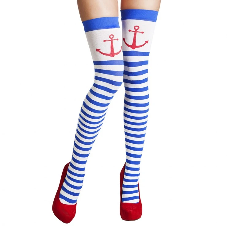 Ces bas sont rayĂ©s blanc et bleu et imprimĂ©s d’une ancre rouge.