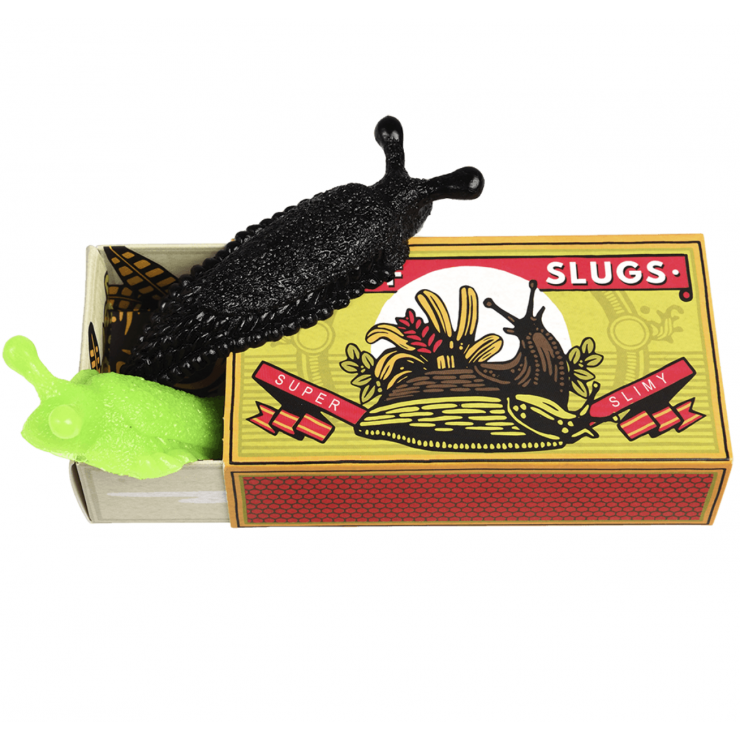 La boĂ®te, conçue comme une boĂ®te d’allumettes gĂ©ante, contient deux limaces super gluantes.