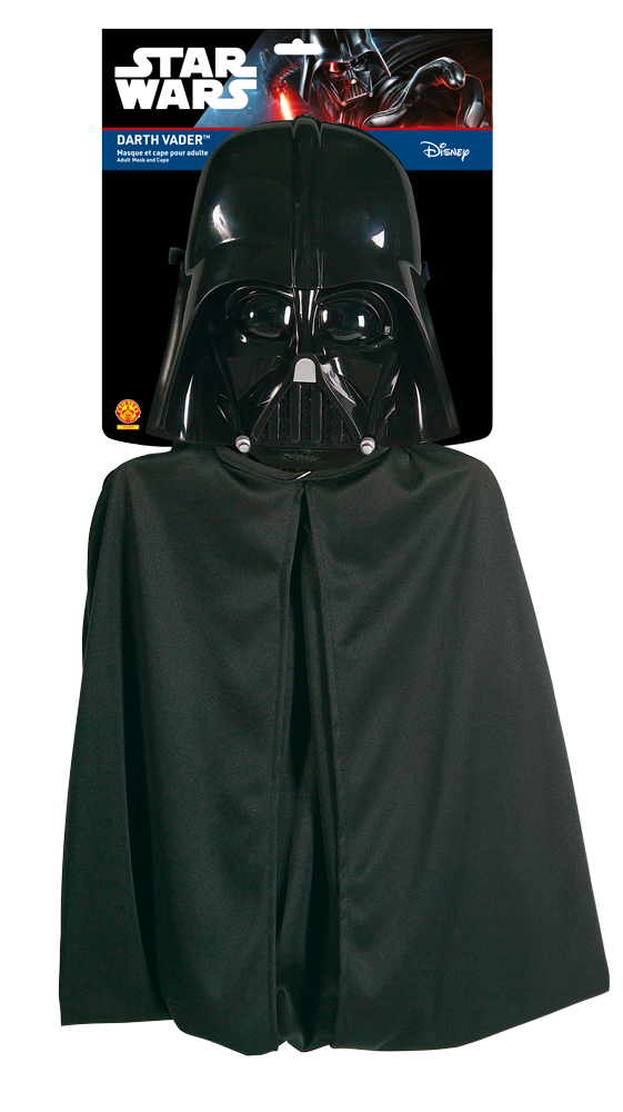 Un kit de déguisement comprenant un masque rigide en PVC à l’effigie de Dark Vador avec attache élastique et une longue cape noire avec attache velcro dans le cou.