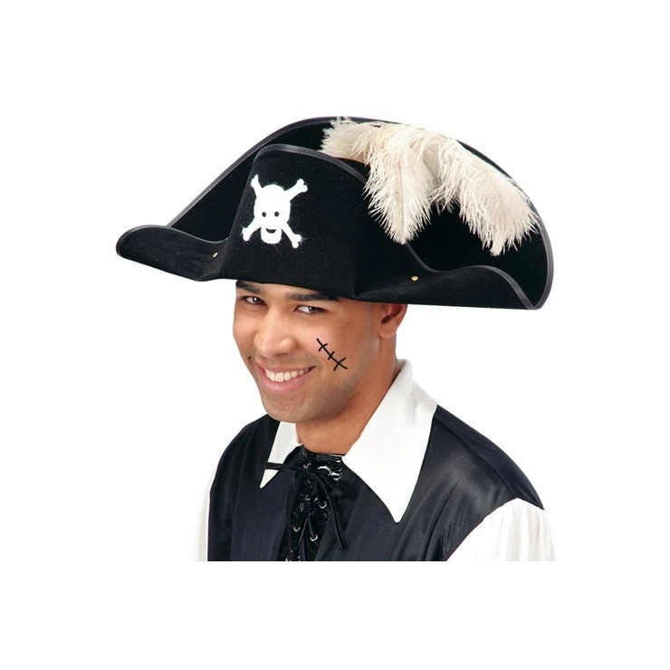 Chapeau de pirate noir avec plume blanche.
