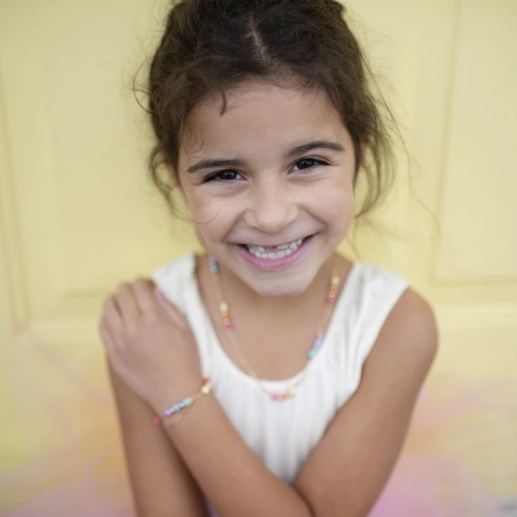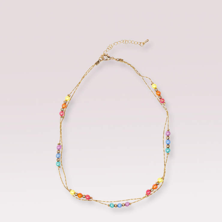 Une combinaison unique de chaĂ®nes dorĂ©es et de perles arc-en-ciel nacrĂ©es et mĂ©talliques rend ce collier aussi Ă©lĂ©gant qu’amusant.