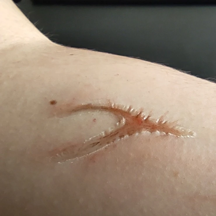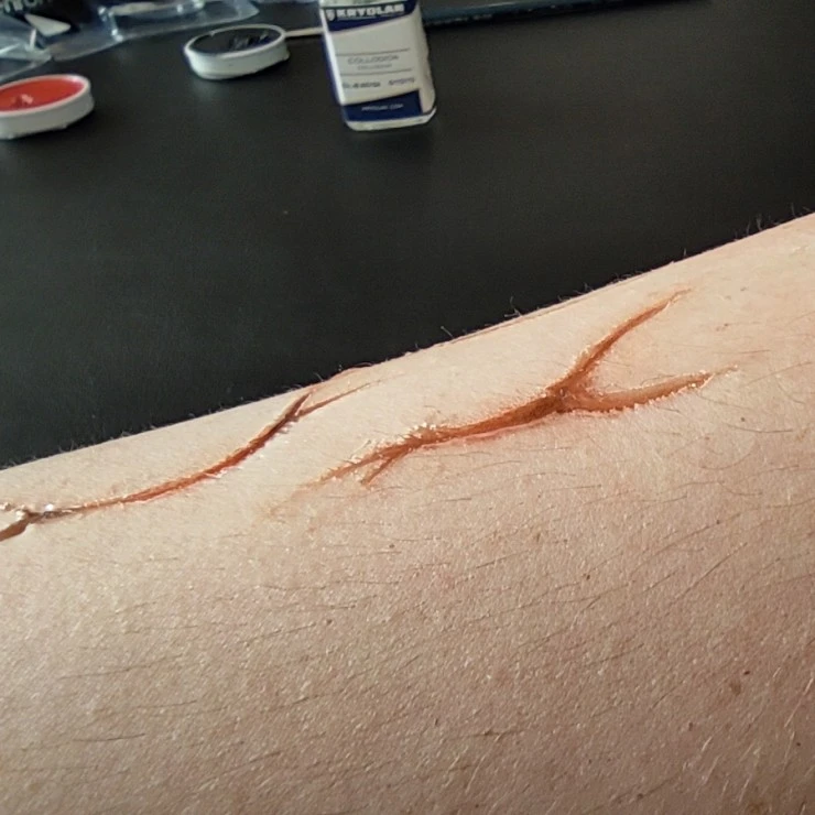 Le collodion est un produit classique pour la crĂ©ation de fausses cicatrices. Le collodion, qui sèche très vite, est d’abord appliquĂ©e sur la peau. La peau est ensuite pressĂ©es en deux points pour former un pli. Le rĂ©sultat du pli donne l’impression d’une cicatrice.