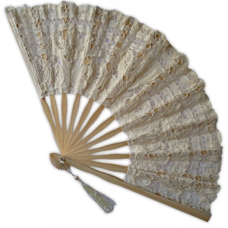Cet Ă©ventail est conçu en bambou et dentelle de coton. Il est ornĂ© d’un pompon ivoire.