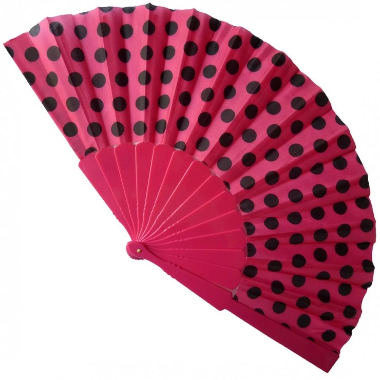 Cet éventail est réalisé en plastique fushia et tissu fushia à pois noirs.