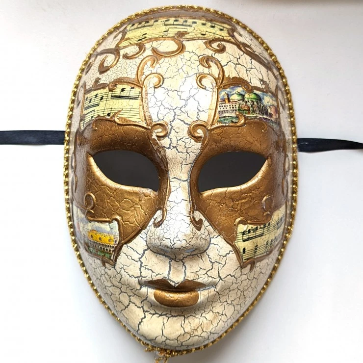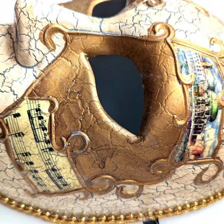 Ce joli masque est décoré de volutes, de notes de musiques et de peintures de Venise.
