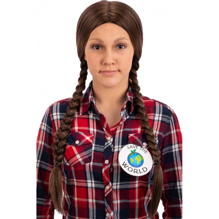 Cette perruque d’aspect naturelle est brune avec raie au milieu et intègre deux très longues tresses.
