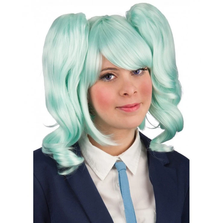 Cette perruque de couleur vert d’eau effet naturel intègre deux grandes couettes.