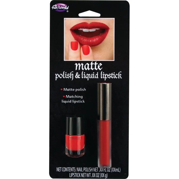 Tube de rouge à lèvres mate rouge et son vernis à ongles assorti.