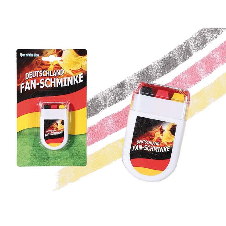Ce stick de maquillage noir rouge jaune permet aux supporteurs de l’Ă©quipe d’Allemagne de se maquiller Ă leurs couleurs en un passage.