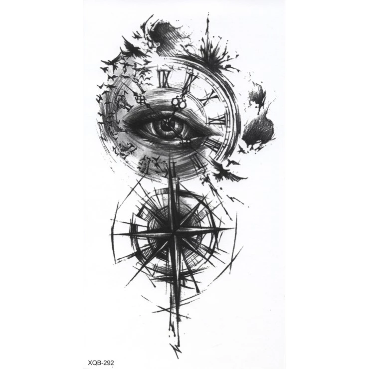 Son dessin en noir et blanc représente une rose des vents et une montre à gousset dans laquelle se trouve un œil.